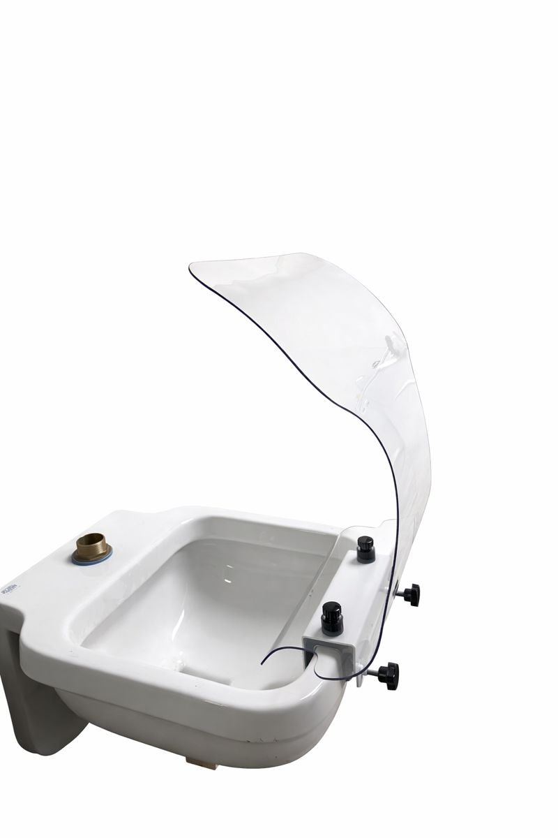 The Shield™ Splash Guard simply affixes to hopper, utility, waste, and service sinks, to protect your face and body from splashing caused by waste being poured down the drain. Made of a synthetic copolymer material, the splash guard flexes for staff comfort and is transparent for the most visibility. The Shield™ Splash Guard is extremely sturdy and should withstand years of rigorous use.
